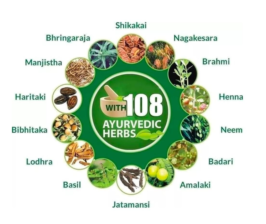 Neem, Tulsi, Turmeric, Aloe Vera, Sandalwood, Rose, Ashwagandha, Brahmi, Hibiscus, Vetiver, Coconut Oil, Olive Oil, and other herbal infusions.