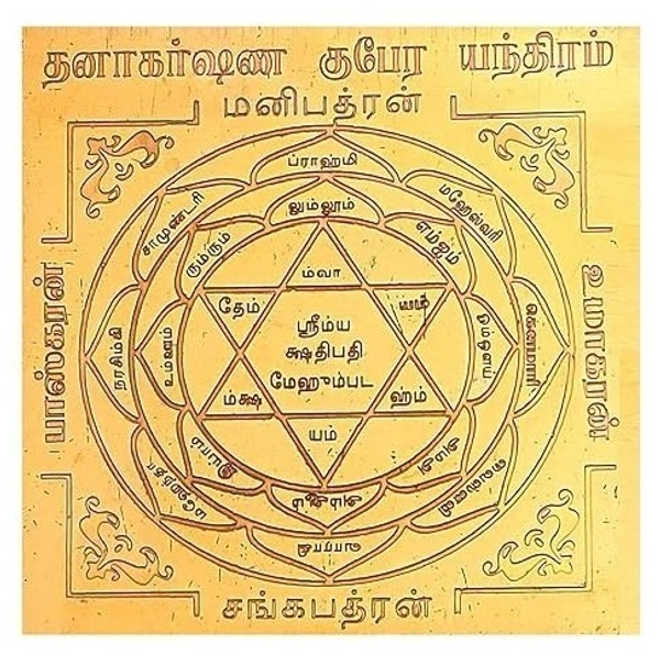 Lakshmi Dhanakarshana Kubera Yantra - the deity in the form of an intricate geometric pattern. Lakshmi is believed to be the bringer of wealth and prosperity. She is the divine consort of Lord Vishnu, or Narayana. The goddess is fervently worshipped year round, but especially on the day of Varalakshmi. Kuber, or Kubera, is the celestial Banker. Made with great attention to detail, this Yantra presents a complex geometric design, which is not only aesthetic but also holds deep spiritual significance. The placement of different shapes and sacred symbols, along with important mantras, is believed to resonate with the divine energy of Goddess Lakshmi, inviting wealth and prosperity into the lives of the devotees. The Lakshmi Dhanakarshana Kubera Yantra is an ideal addition to any pooja space. Performing pooja for/with this yantra can bring you closer to the divine, with blessings, guidance, and a sense of peace and tranquillity. Whether you are a devout follower of Hindu culture or someone seeking a unique piece of traditional art, this yantra is a perfect match for you.