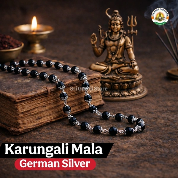 Karungali wood is believed to absorb negative energy, improve focus, and bring mental stability. The German silver enhances the look while remaining rust-resistant and long-lasting, making it suitable for daily spiritual wear.