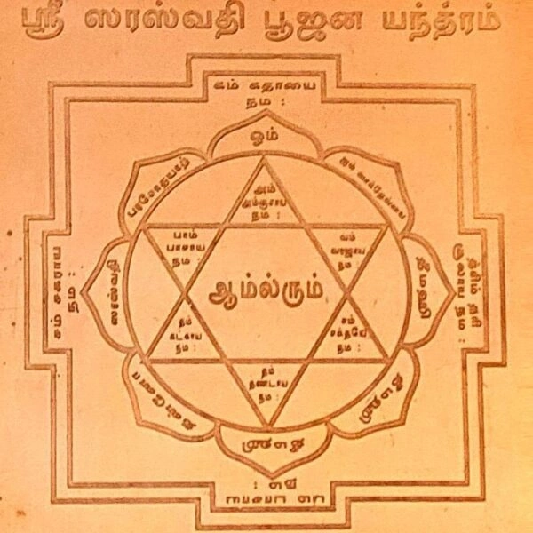 Saraswati Yantra powerful Yantra is a sacred geometric symbol that is used to invoke the blessings of “Goddess Saraswati”, the deity of Knowledge, Wisdom, Arts, and Learning. Inscribed with faith in copper, this Yantra signifies the divine presence of Saraswati. It typically consists of intricate geometric patterns and symbols. Devotees use this Yantra to seek her blessings for academic success, artistic creativity, and overall intellect. By meditating upon this Yantra, one aims to attain spiritual insight and enhance their mental faculties, making it a cherished symbol in Hindu worship.